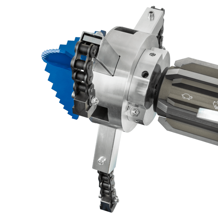 The Blue100 Spider HD chain scrapper “Heavy Duty” reliably removes roots and works at least as well as a milling tool. The flywheel plate with its kinetic energy is the basis for further applications such as the saw blade, the milling head or the diamond cutter.