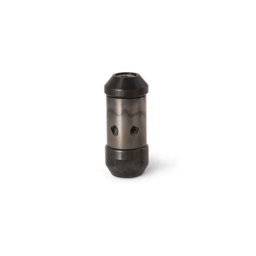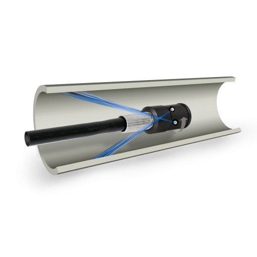 The semiradial (HRR) nozzle with 4 backwards-pointing cutting jets. The 4 cutting jets are oriented 43° backwards and produce the forward traction and accomplish the cleaning itself. Thus, the spinning drive and thrust jets are part of the same function. As with all spinning nozzles with a water gap guide, the spinning motion is produced by a rotor sliding on the water film around the stator axis.