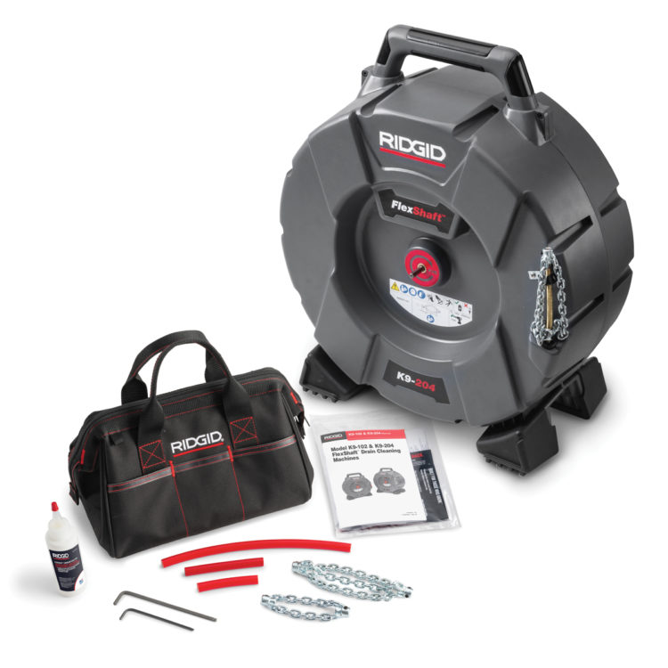 The FlexShaft K9-204+ drums are compact and highly efficient machines that offer complete high-speed pipe cleaning from 50 – 100 mm (2″ to 4″). FlexShaft can also be operated when an inspection camera is located in the pipe so that the inside of the pipe can continue to be inspected during cleaning.