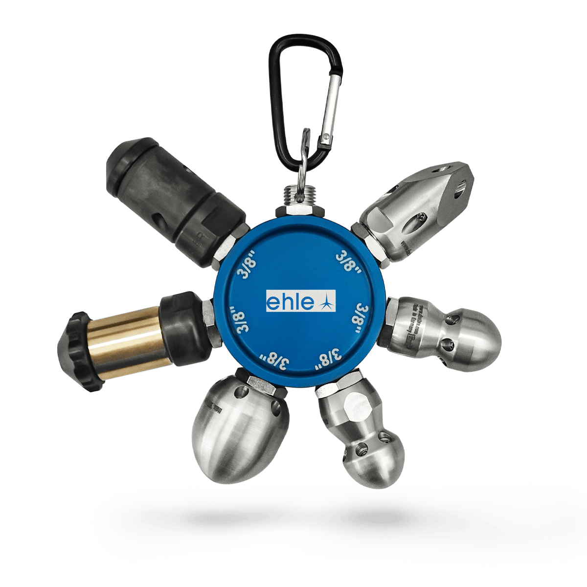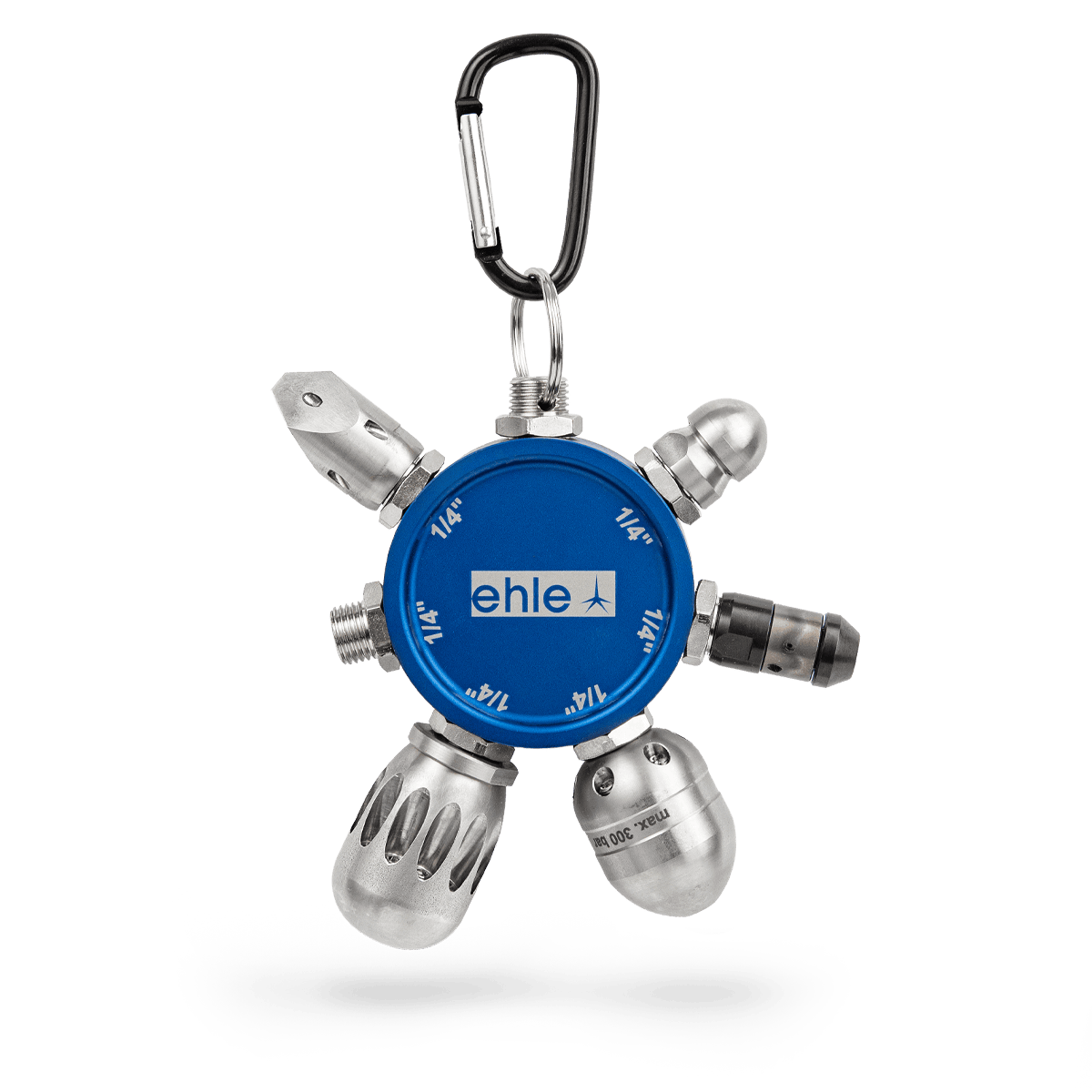 With the practical “All on One” nozzle hanger with pipe cleaning nozzles, you are well equipped for any cleaning task. With this compact and handy tool, you carry all common nozzles in 1/4″, 1/8″, or 3/8″ – right on your belt. You will never have to fetch the right nozzle during a job again. The hanger provides a convenient solution by keeping all essential nozzle types within reach.