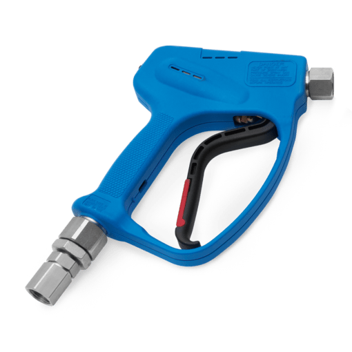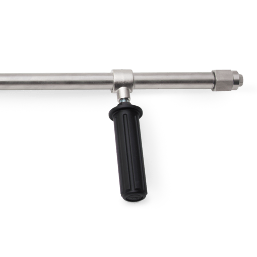 The robust stainless steel high-pressure water spray gun with round steel for the cleaning of shafts and other surfaces.