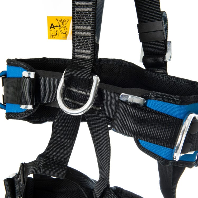 The full-body harness/ seat harness is a fully adjustable safety harness for fall protection and positioning in the rope. It has a front and rear safety eyelet (D-ring). All attachment points for the fall protection are equipped with a clearly legible A.