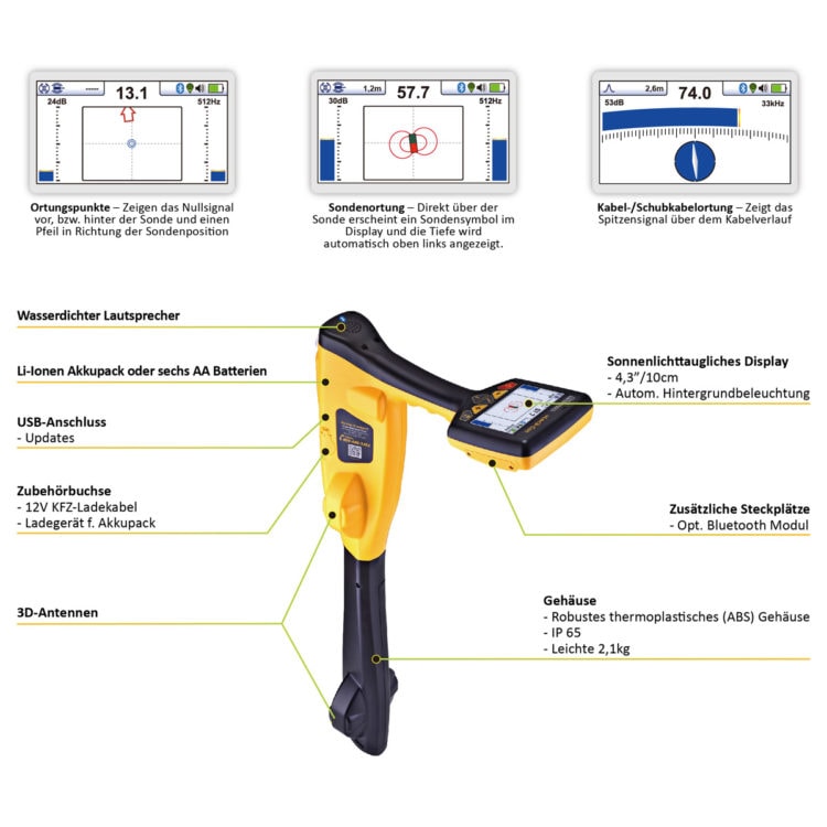 The omnidirectional antenna arrangement allows the probe to be reached from any position. The directional arrows guide the user first to the front or rear locate point and then directly to the probe location.