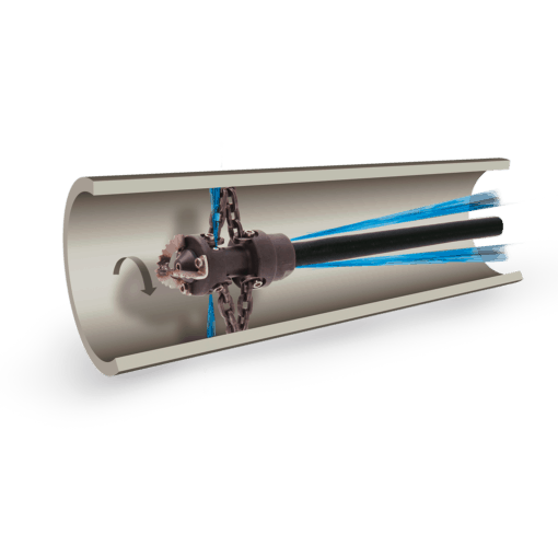 Die Kettenschleuder ist ein Rotationswerkzeug, das vorwiegend zur Beseitigung von Wurzeln oder festen Ablagerungen, wie Kalk und Zementschlamm, eingesetzt wird. Der mit drei Antriebsdüsen versehene Rotor wird so in Rotation versetzt, dass die auf den Rohrdurchmesser angepasste Kette zur Zentrierung der Kettenschleuder im Rohr führt. Durch die genau definierte Schleifwirkung der Kette sowie den 90°-Aufprallwinkel der Antriebsstrahlen ergibt sich die sehr gute Abbauleistung der Spezialdüse.