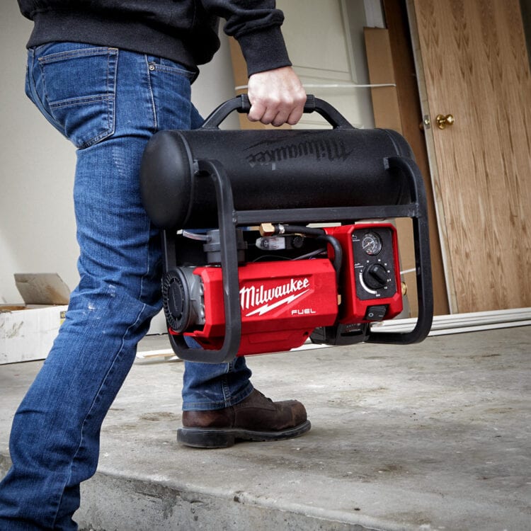 - Mit einem Gewicht von 14 kg und zwei Tragegriffen kann der Kompressor problemlos auf der Baustelle transportiert werden
